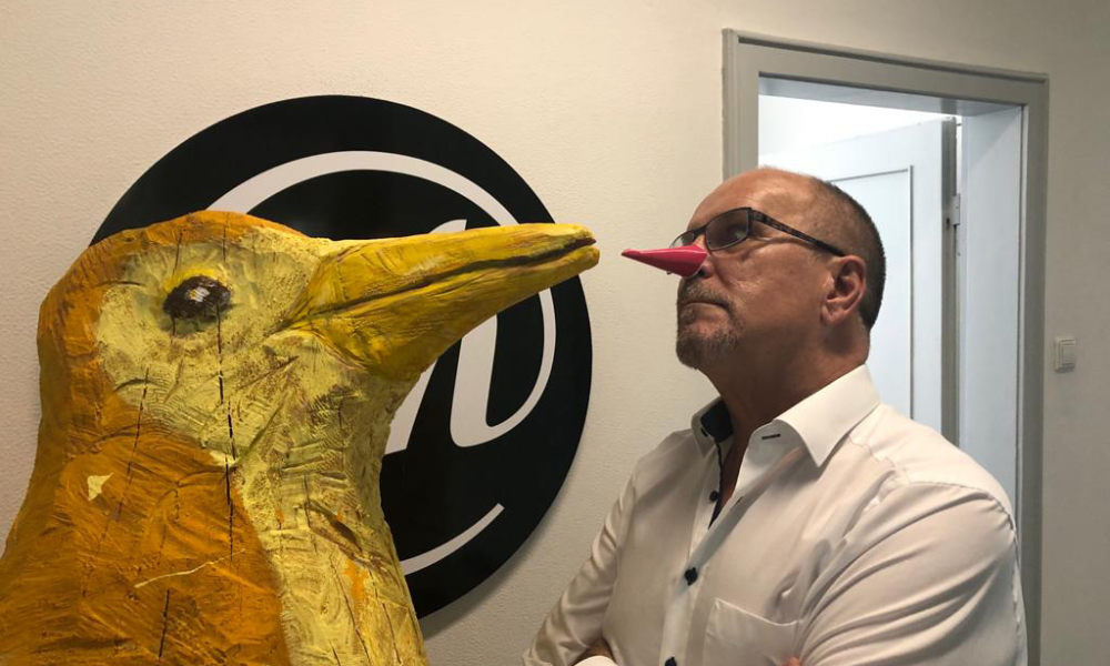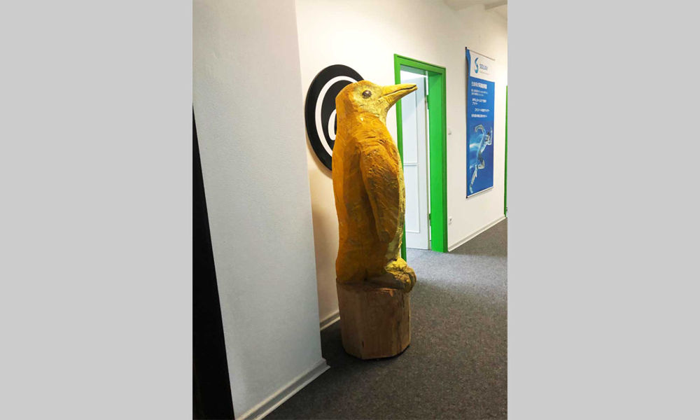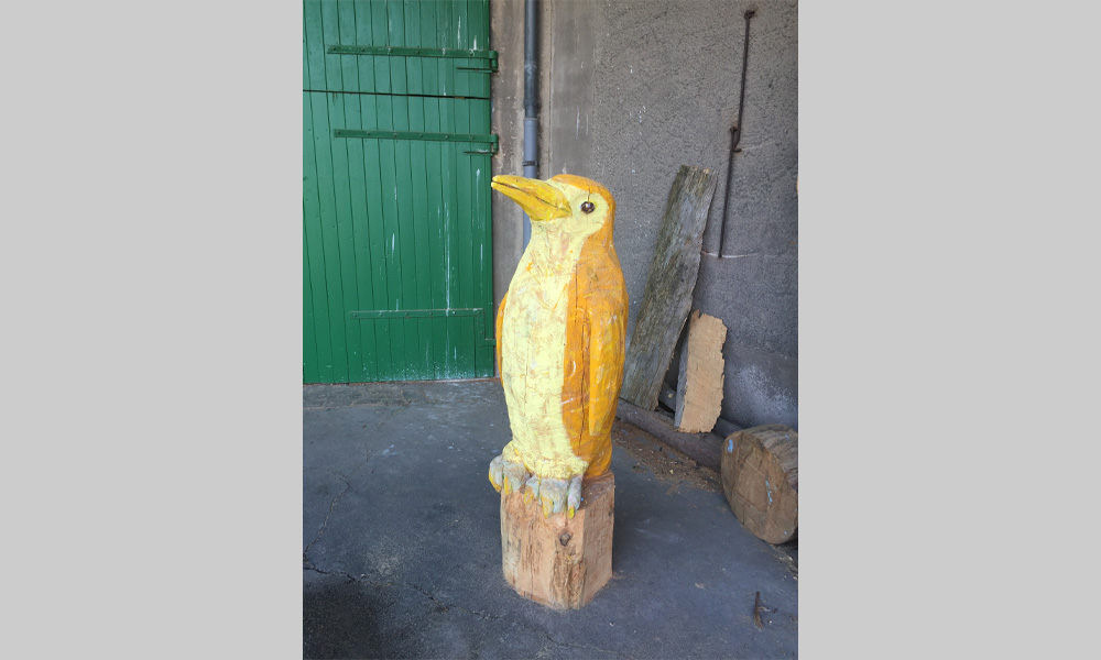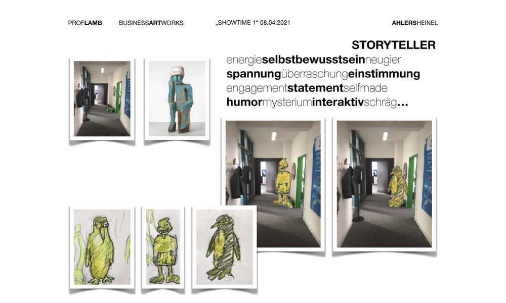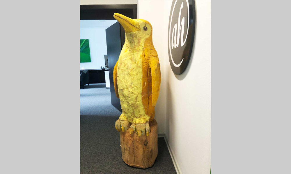 Die Firma Ahlers-Heinel ist eine der ältesten Werbe-Agenturen in Hannover, die für Ihre Kunden in den letzten Jahren vor allem maßgeschneiderte Image-Filme konzipiert und umsetzt. Dabei ist dem Unternehmen vor allem ein gutes „Storytelling“ wichtig, für welches nun humorvoll personalisiert „Stoerry“, ein gelber Pinguin-Character aus massivem Stammholz steht. Passend zur neuen Konzeptfarbe „Gelb“ des Unternehmens empfängt „stoerry" Kunden ebenso wie Mitarbeiter am Eingang in die Agentur mit seiner magischen, kraftvoll strahlenden „Gelb-Präsenz" und seiner verschmitzten guten Laune. Er formuliert so ein Versprechen, dass an diesem Ort für alle Beteiligten außergewöhnliches geschehen kann.