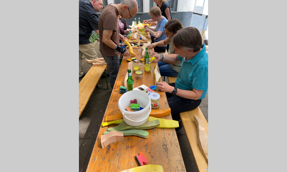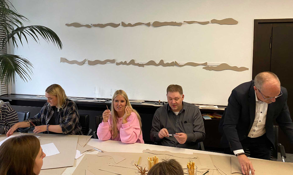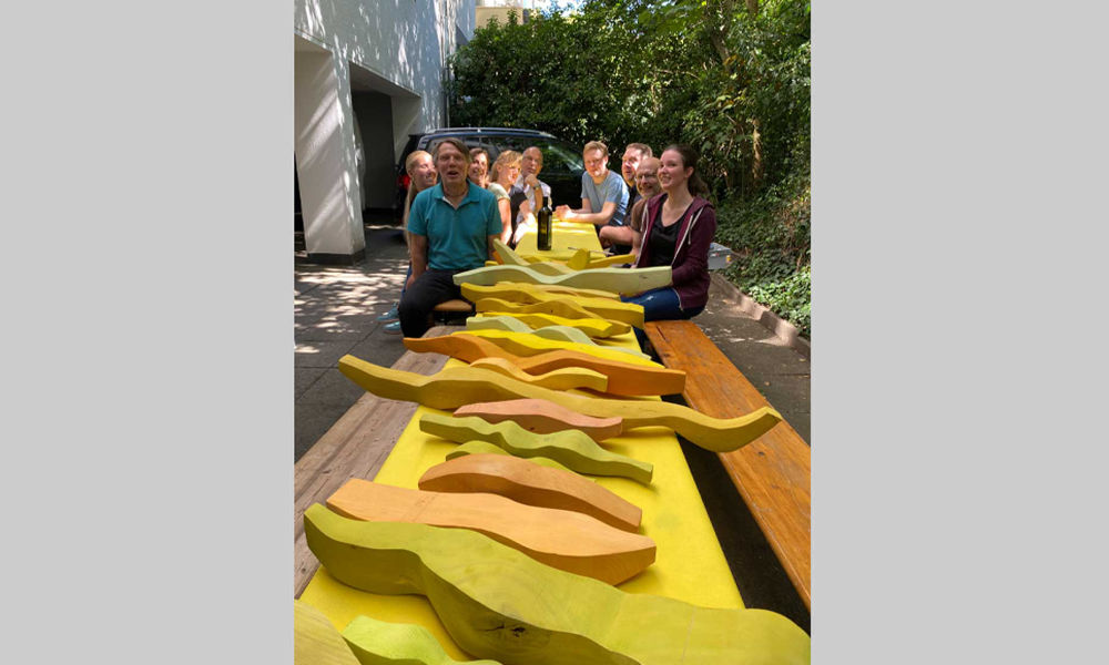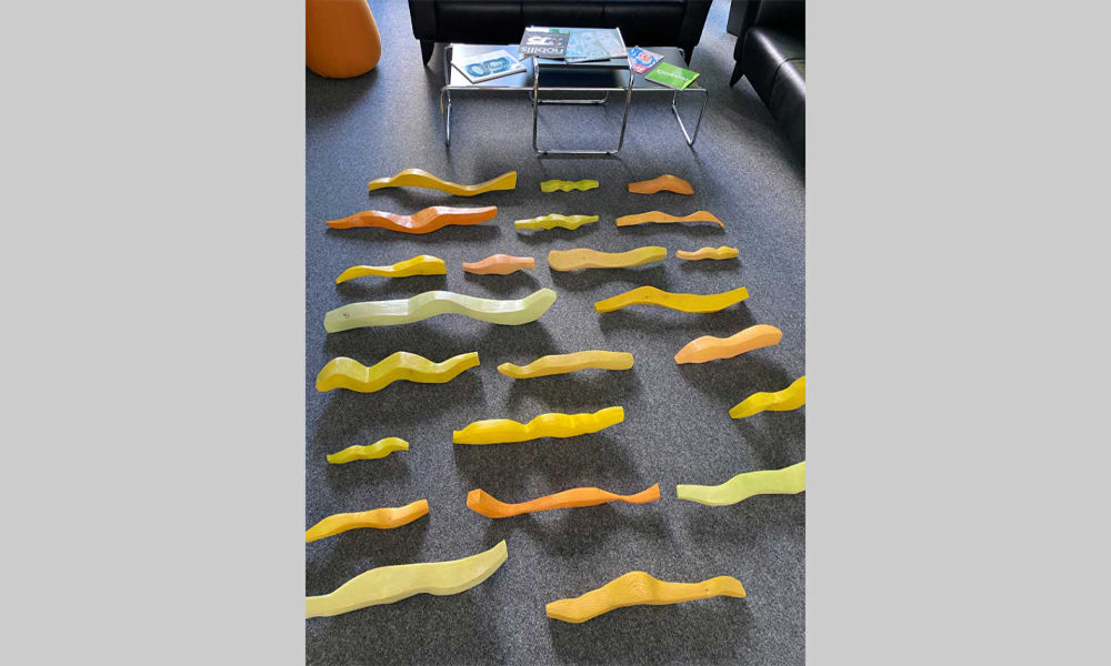 Zudem hat sich das Unternehmen auch für die Umsetzung des Konzeptes „Personal Waves“ entschieden. In einem ersten Workshop skizzierten alle Agenturmitarbeiter(innen) ihre persönlichen Wellenformen als Pappschablone. Diese wurden dann im Atelier von BAW dreidimensional in Holz hergestellt. In einem zweiten Workshop fassten die Mitarbeiter (innen) dann ihre Wellen in verschiedenen Gelbtönen, so dass ein breites Spektrum der neuen Konzeptfarbe entstand. Dieses Objekt-Ensemble wird nun im Flur des Unternehmens installiert, wodurch jedes Mitglied des Teams über sein Objekt auf künstlerische Weise abgebildet wird.