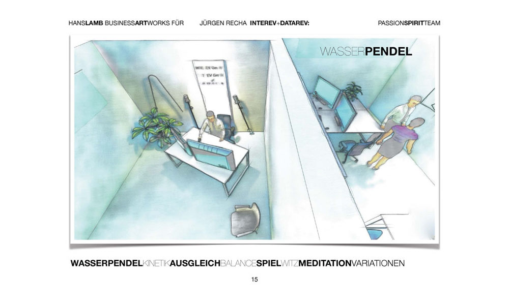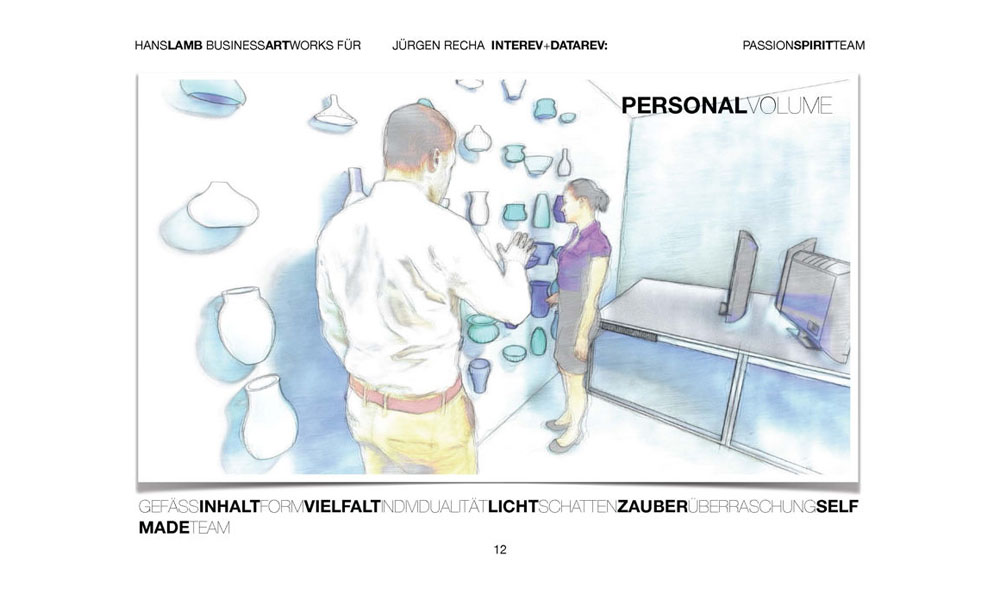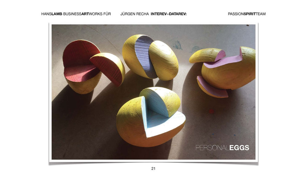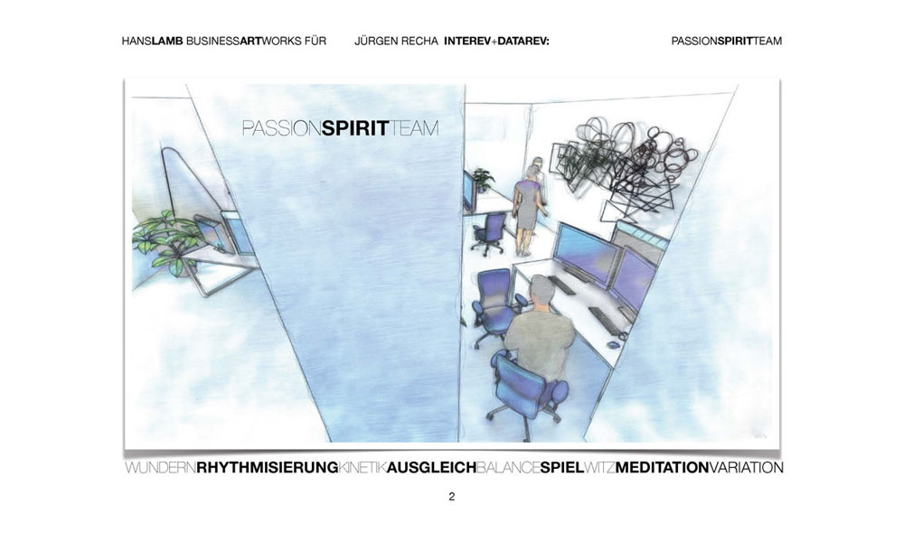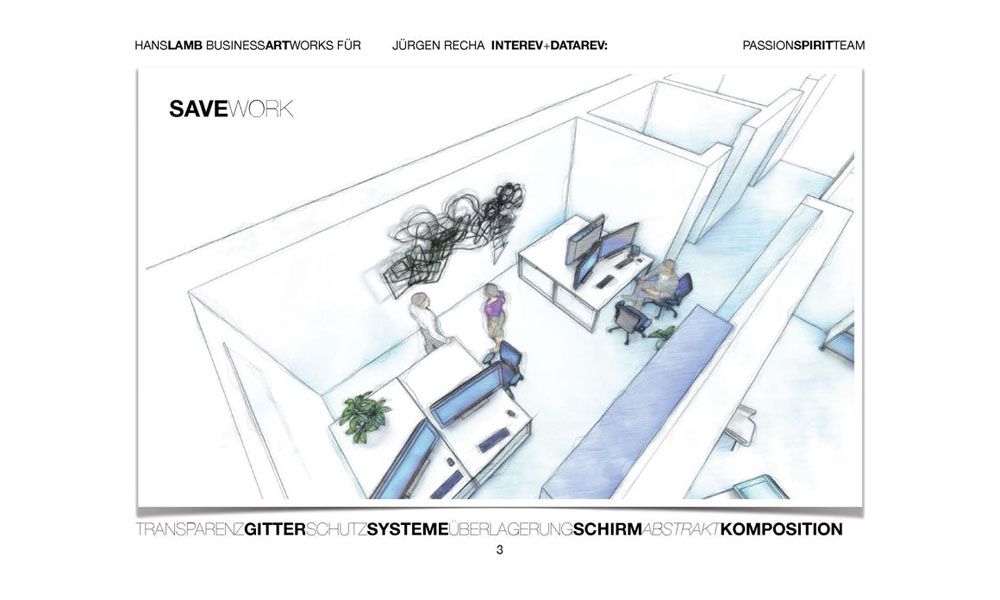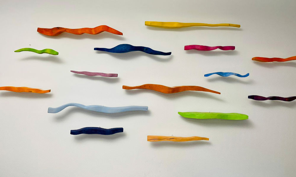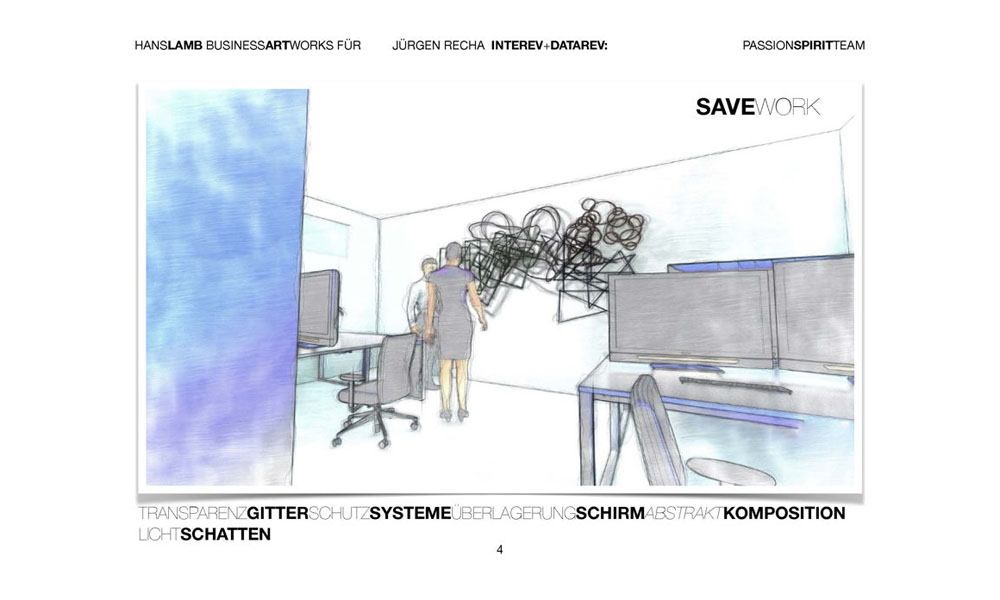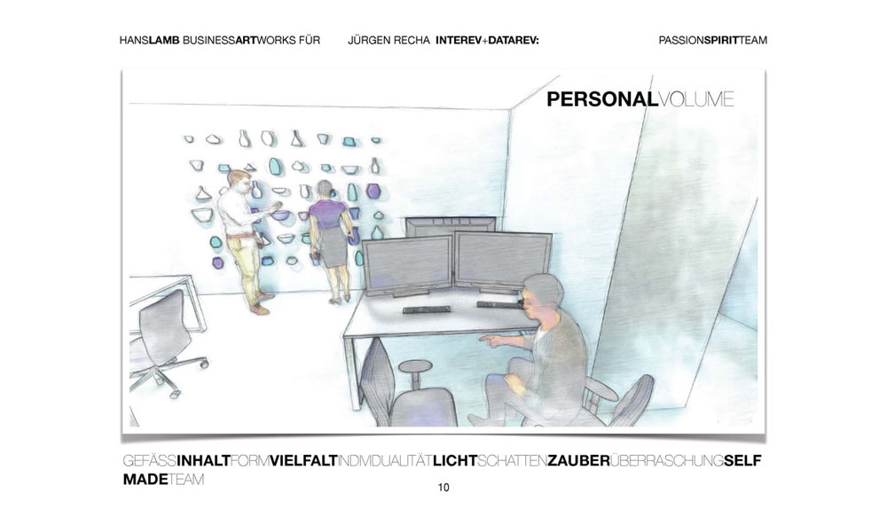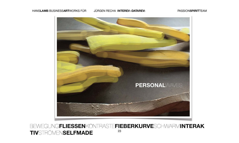 Mittelpunkt der Arbeit mit und für die Langenhagener Unternehmen „INTEREV“ und „DATAREV“ war die Arbeit „Personal Waves“, welche die Mitarbeiter (innen) sehr aktiv ins künstlerische Geschehen hineinziehen konnte: In einem ersten Workshop skizzierten alle Mitarbeiter(innen) ihre persönlichen Wellenformen als Pappschablone. Diese wurden dann im Atelier von BAW dreidimensional in Holz hergestellt. In einem zweiten Workshop fassten die Mitarbeiter (innen) dann ihre Wellen in ihren jeweiligen Wunschfarben, so dass ein buntes Wellen-Spektrum entstand. Dieses Objekt-Ensemble wurde noch am gleichen Tag zusammen im Gemeinschafts-Büro des Unternehmensinstalliert, wodurch jedes Mitglied des Teams nun über sein Objekt auf künstlerische Weise abgebildet wird. Konzeptionelle Arbeiten dieser Art steigern durch die Beteiligung der Mitarbeitenden und durch die repräsentative optische Aufwertung des Arbeitsplatzes die Identifikation mit dem Unternehmen.