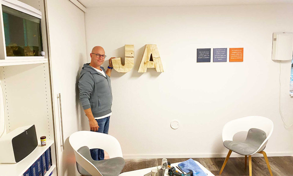 Der Unternehmensleiter Jürgen Recha schenkte sich für sein Büro noch eine weitere künstlerische Arbeit. Das aus Weidenholz mit der Kettensäge gefertigte Wort “JA „ erinnert ihn einerseits an seine Kindheit, in der Weidenbäume eine große Rolle spielten und dient ihm andererseits immer wieder als positive Ausrichtung - als Verstärker und Motto bei seiner täglichen Arbeit.