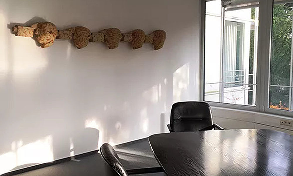 Die Anwaltskanzlei Sina-Maassen in Aachen wählte eine langformatige Holzskulptur, die Kopf- und Kamera-formen in Reihung bringt, für ihren Konferenzraum.