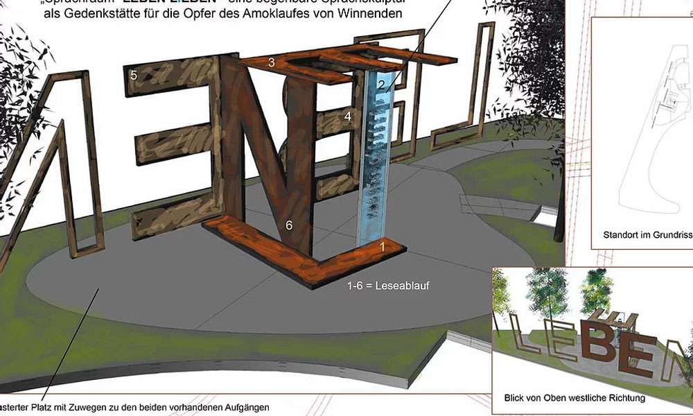 Der offene dreidimensionalen "Sprachraum" LIEBE umgibt den Besucher von allen Seiten und schafft somit eine räumlich geschützte, intime, aber gleichzeitig transparente Situation als Voraussetzung für Gedenken und Andacht. Hier, im Zentrum der Gedenkstätte findet der Besucher die Namen der Getöteten im Buchstaben "I" des Wortes LIEBEN. Die Namen sind in diese 20 bis 50 mm dicke Glas eingraviert oder in Kunststoff gelasert. Der Materialwechsel vom massiven undurchsichtigen Stahl zum transparenten leichten Glas unterstützt dabei die flüchtige, feinstoffliche, körperliche Absenz der Getöteten. Die Pflasterung der Bodenfläche im Bereich des Wortes ist in einer frei stilisierten, jedoch nicht symbolisierten Herzform angelegt. Die beiden bestehenden Nischen der Grünanlage werden dabei folgerichtig als Zuwege zu dem kleinen Platz eingesetzt. Die Unumkehrbarkeit eines Amoklaufes stößt die Hinterbliebenen ins Nichts: Sie müssen sich neu definieren - ihre Ausrichtung, ihren Lebenssinn und ihren Lebenswillen wieder finden: Liebe stellt letztendlich die einzige Möglichkeit dar, selbst zu überleben: Überlebende Angehörige und traumatisierte Zeugen müssen die Liebe zu sich selbst, zu ihrem LEBEN wiederfinden. Die liebende Erinnerung zu den Ermordeten muss eine Form im Leben bekommen - auch sie muss gelebt werden. Alle betroffenen Menschen bilden bewusst oder unbewusst eine Gemeinschaft, in der sie sich in Solidarität und Mitgefühl begegnen. LEBEN LIEBEN und LIEBEN LEBEN beinhaltet so in seiner appellativen Form auch eine übergeordnete Mahnung an uns alle: die Wertschätzung des Lebens und die Liebe als "Wächterin" dieses Lebens ins Zentrum unseres Denkens und Handelns zu bringen - als Schüler genauso wie als Lehrer - unabhängig von Religion, Herkunft oder anderer Merkmale. Mit dieser Auffassung von Liebe und Leben schließt sich in der Gedenkstätte ein Kreis zwischen der medialen und inhaltlichen Ebene: