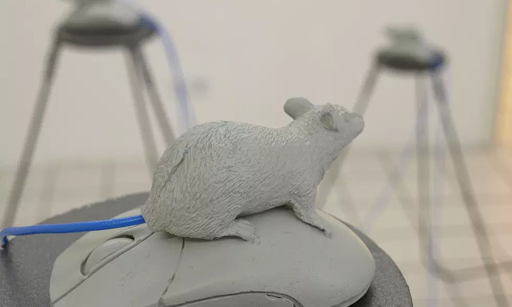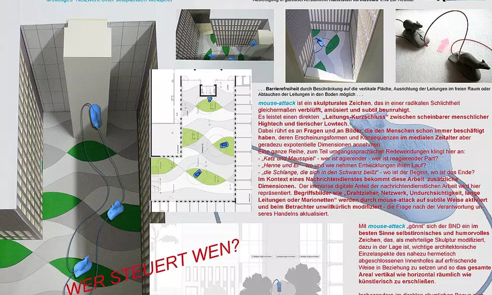 Beitrag zur Ausschreibung Kunst am Bau am Neubau des BND/BKA in Berlin: bei der Arbeit „mouse-attack“ handelt es sich um ein skulpturales Zeichen, das in einer radikalen Schlichtheit gleichermaßen verblüfft, amüsiert und subtil beunruhigt. Es leistet einen direkten „Leitungs-Kurzschluss“ zwischen scheinbarer menschlicher Hightech und "tierischer Lowtech". Dabei rührt es an Fragen und an Bilder, die den Menschen schon immer beschäftigt haben, deren Erscheinungsformen und Konsequenzen im medialen Zeitalter aber geradezu expotentielle Dimensionen annehmen.Zwei überdimensionale Tier-Mäuse sitzen auf je einer überdimensionalen Computer-Maus. Dabei führt der Schwanz der einen Tier-Maus in das Kabel der Computer-Maus, auf der die andere Tier-Maus sitzt und das Ganze natürlich auch umgekehrt. Auf diese Weise entsteht ein höchst fragwürdiger, vermeintlicher Regel-Kreislauf zwischen Kreatur und Maschine.