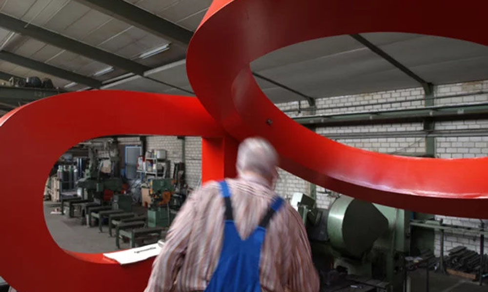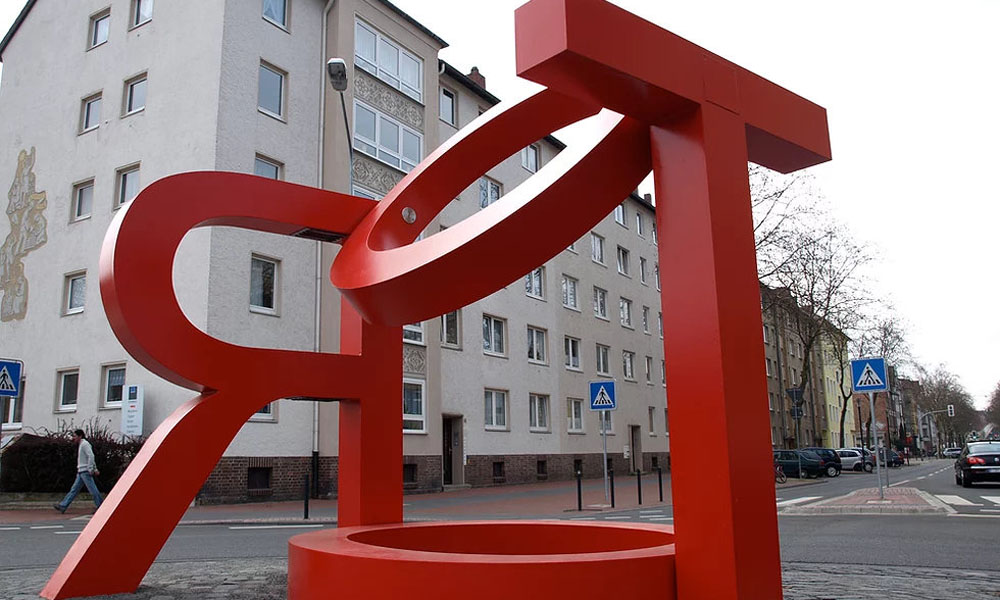 Die gesamte Skulptur ist konzeptionell in der Farbe Rot lackiert, was ihr nicht nur eine besondere optische Präsenz verleiht, sondern darüber hinaus auf verschiedene historische Aspekte des Stadtteils verweist.