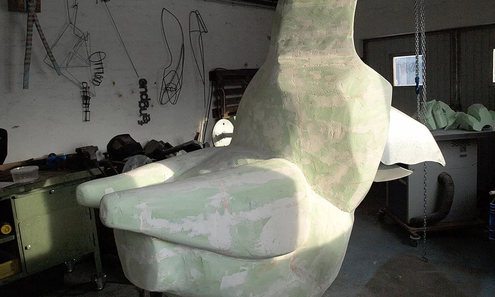 Die Umsetzung der Skulptur beginnt über: plastische Skizzen in Ton, Modellieren der Endfassung, digitaler 3D-Scan und digitalem Fräsen in Hartschaum auf Endgröße.