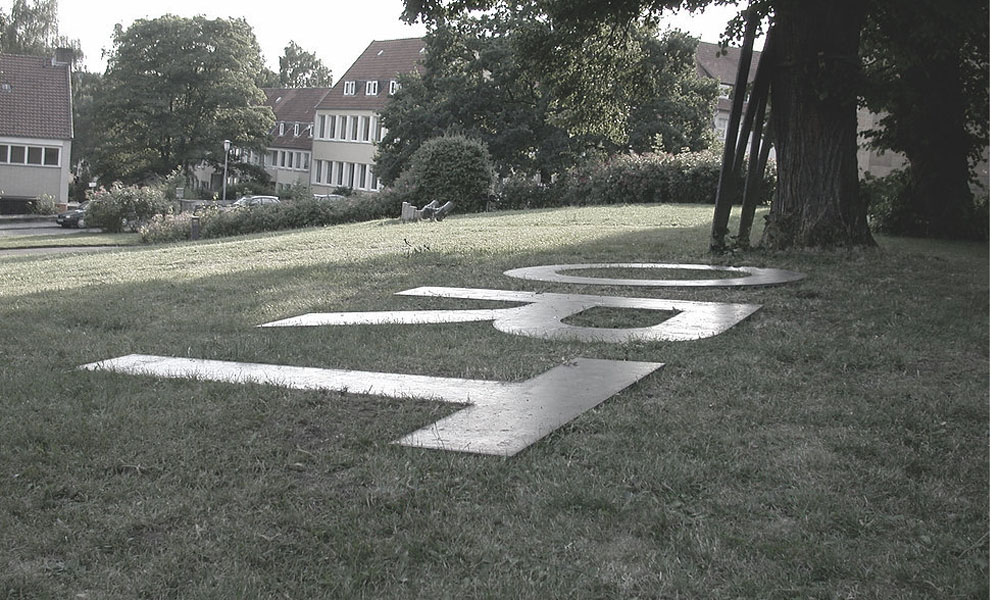 Bei der Skulptur „W ORT“ handelt es sich um ein gewaltiges Stück Konkrete Poesie im Raum. Die vier Buchstaben W, O, R und T sind aus jeweils 20 mm starkem Stahl gefertigt, haben eine Höhe von 240 cm und bilden somit eine Gesamtlänge von ca. 10 Metern.