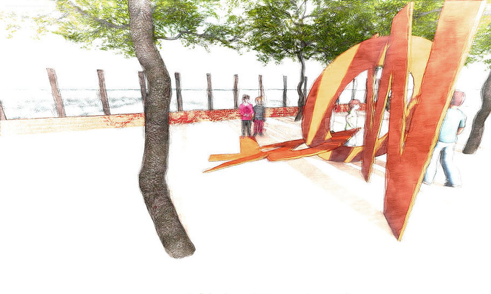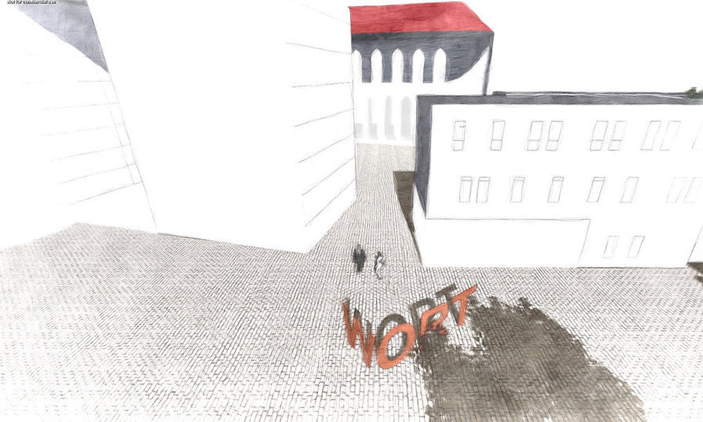 Die flach auf dem Boden angeordneten Buchstaben O, R und T tun exakt und überaus konkret das, was sie auf der Sprachebene versprechen: sie markieren und definieren durch ihr horizontales Liegen einen spezifischen „ORT“. Der Buchstabe „W“ hat sich jedoch aus der gewohnten, horizontal-sicheren Lage befreit und entwickelt so im wahrsten Sinne des Worte eine eigene Dimension - nämlich die des dreidimensionalen Raumes. Es entsteht somit ein begeh- und begreifbarer „Sprachraum“ in einer klaren, elementaren „Raumsprache“, der sich, platziert im öffentlichen Aussenraum hervorragend als „Landmark“ und „Meeting-Point“ eignet. Im Zusammenhang von Firmen, Institutionen, Konzernen, Veranstaltungen, bei denen es um gesprochene oder geschrieben Sprache, um Kommunikation oder Standorte geht, entsteht eine hundertprozentige Synchronisation und Deckungsgleiche zwischen Kunstwerk und inhaltlichem Kontext - ein Maximum an Repräsentation - es entsteht ein Statement in Sachen Verbindlichkeit und Identifikation.